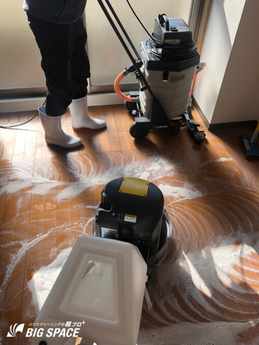 その後 床のPH値を整えてフローリングにぴったりと相性の良いワックスでコーティングしていきます。