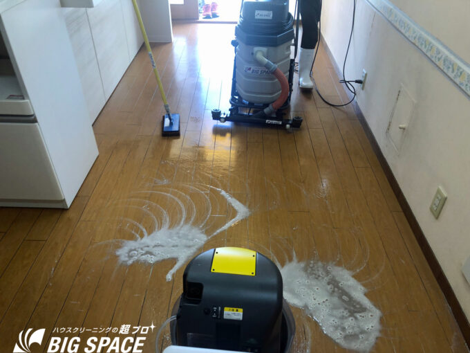 フローリングに関しても 既存の黒ずんだワックスを 完全剥離作業 しっかりリンスもして