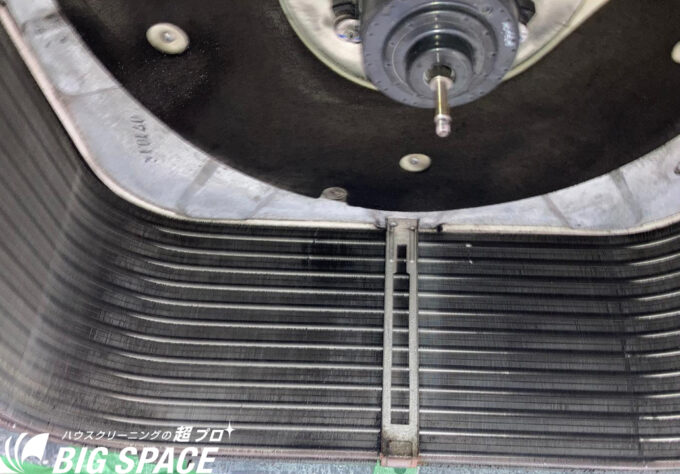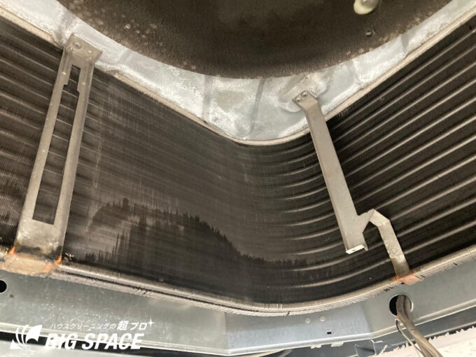 アルミフィンの隙間にも鉄粉ホコリ汚れがびっしり…。
