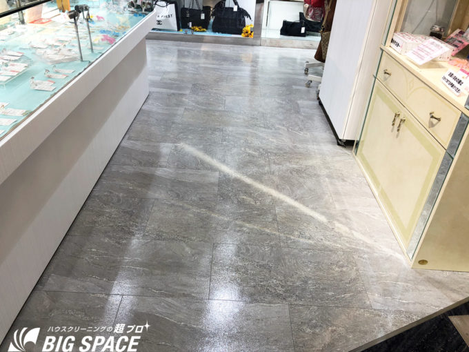 高級ブランドのバッグや貴金属 が 並べられた店内 かんてい局様の床洗浄ワックス