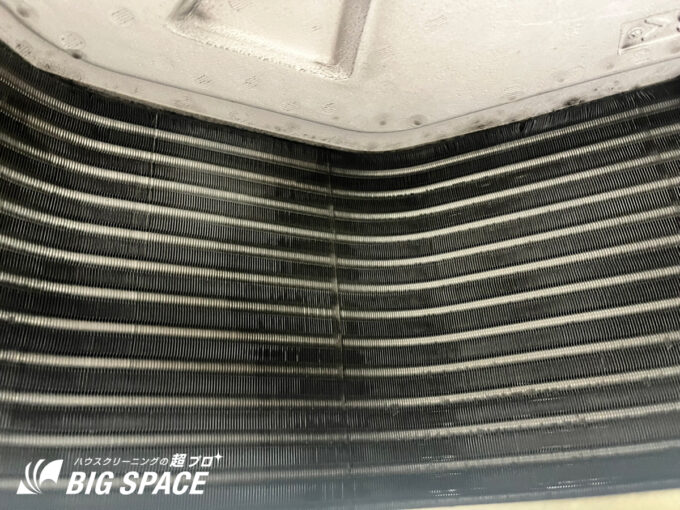 天カセ形エアコンの心臓部である熱交換器(アルミフィン)は、極めて細かな隙間で構成されています。ここに埃や油煙、カーボンなどの微粒子が付着すると、熱交換効率が著しく低下します。